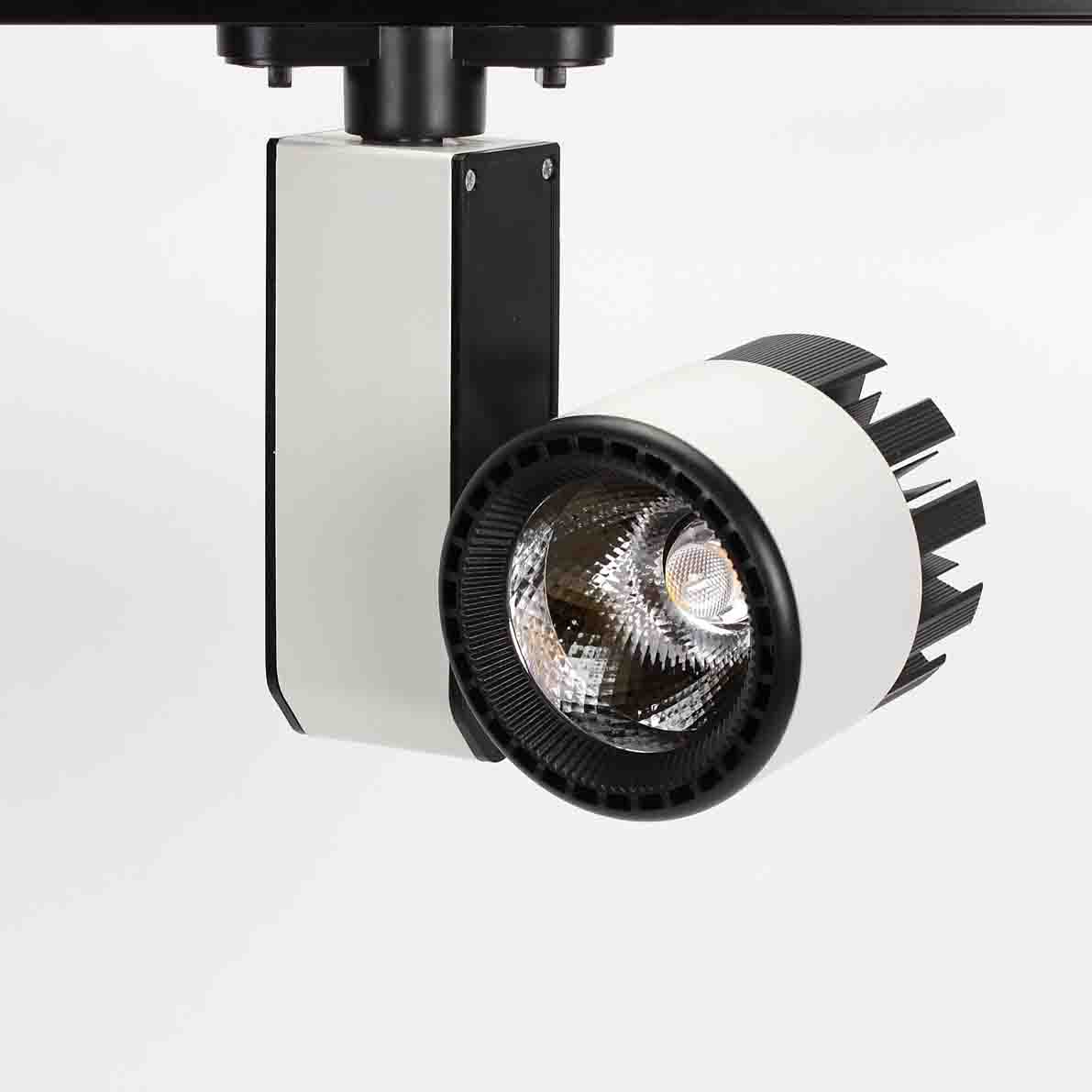 Трековый светильник. Белый с черным корпус. Технология COB. Напряжение 85-265V, мощность 20W, цвет свечения белый 6000K, световой поток 2000Lm. Угол свечения 30 градусов. Класс защиты IP40. Устанавливается на трехпроводной шинопровод. Размеры 105x180x200мм. Вес 560гр.