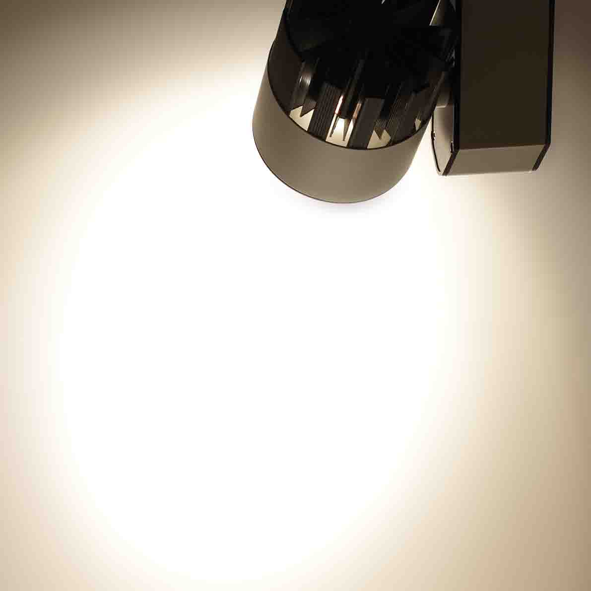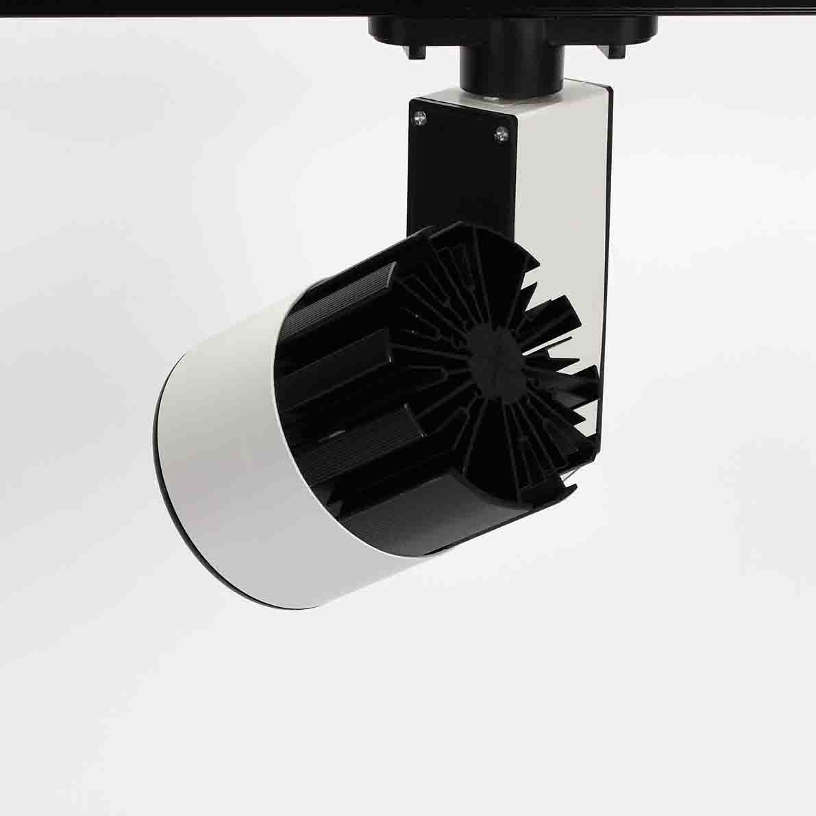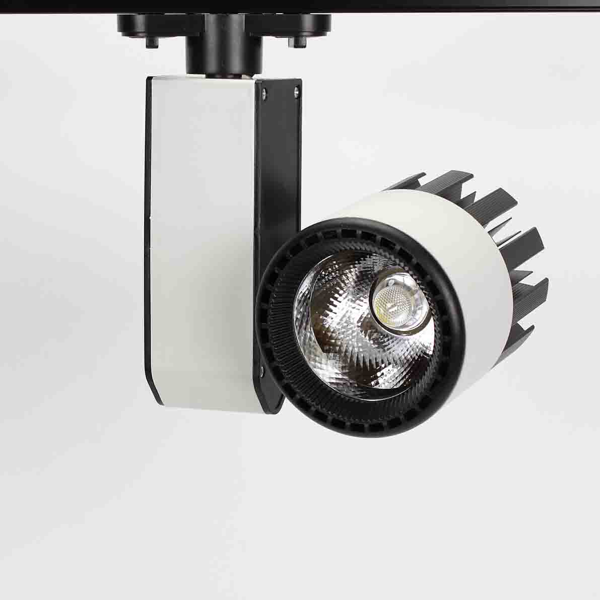 Трековый светильник. Белый с черным корпус. Технология COB. Напряжение 85-265V, мощность 30W, цвет свечения дневной белый 4000K, световой поток 3000Lm. Угол свечения 30 градусов. Класс защиты IP40. Устанавливается на трехпроводной шинопровод. Размеры 120x180x200мм. Вес 670гр.
