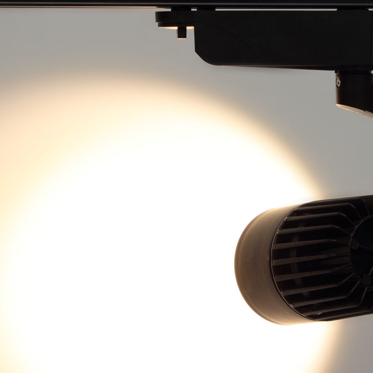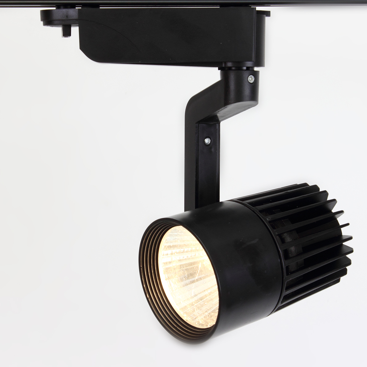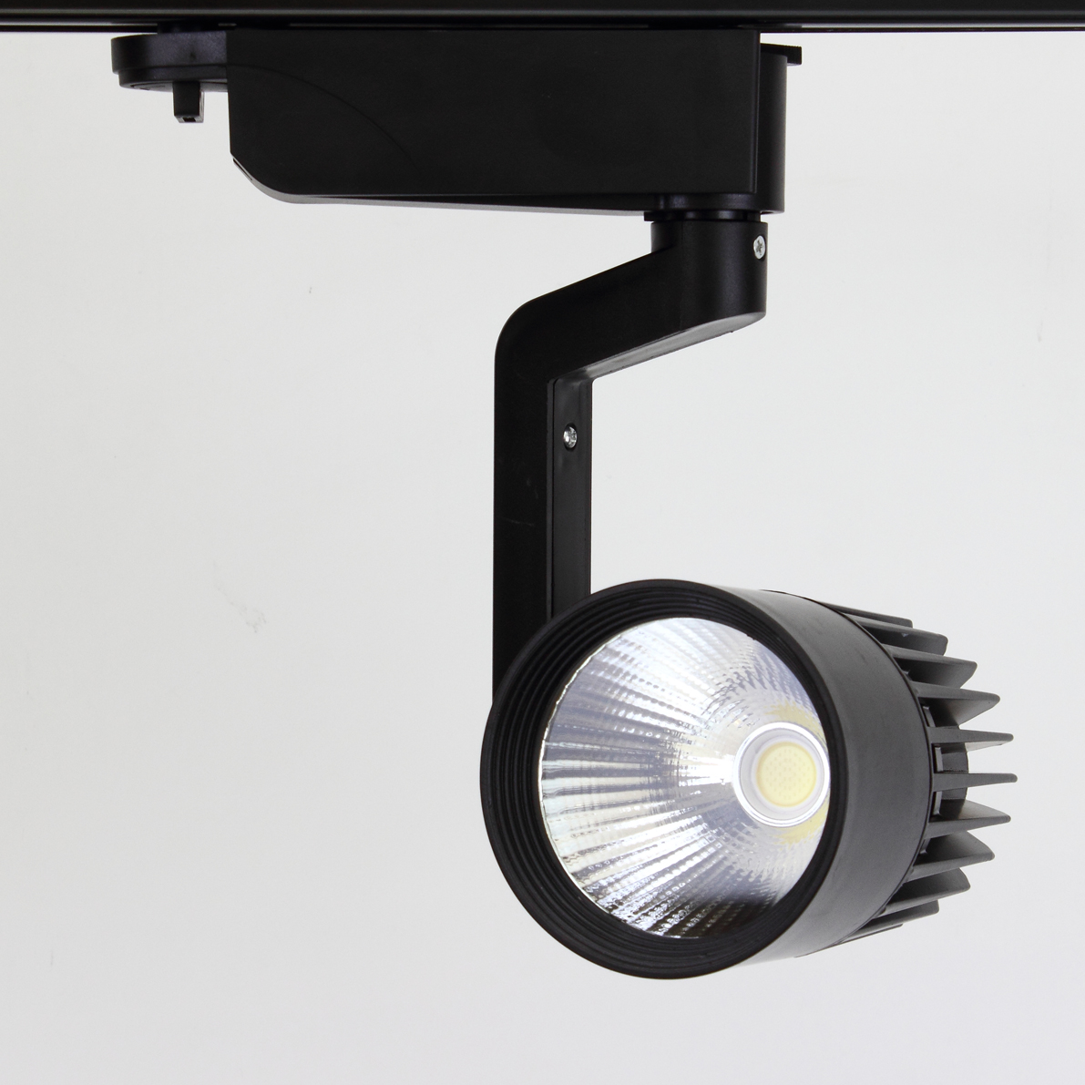 Трековый светильник. Черный корпус. Технология COB. Напряжение 85-265V, мощность 20W, цвет свечения теплый белый 3000-3500K, световой поток 2000Lm. Угол свечения 30 градусов. Класс защиты IP40. Устанавливается на трехпроводной шинопровод. Размеры 160x220x220мм. Вес 550г.