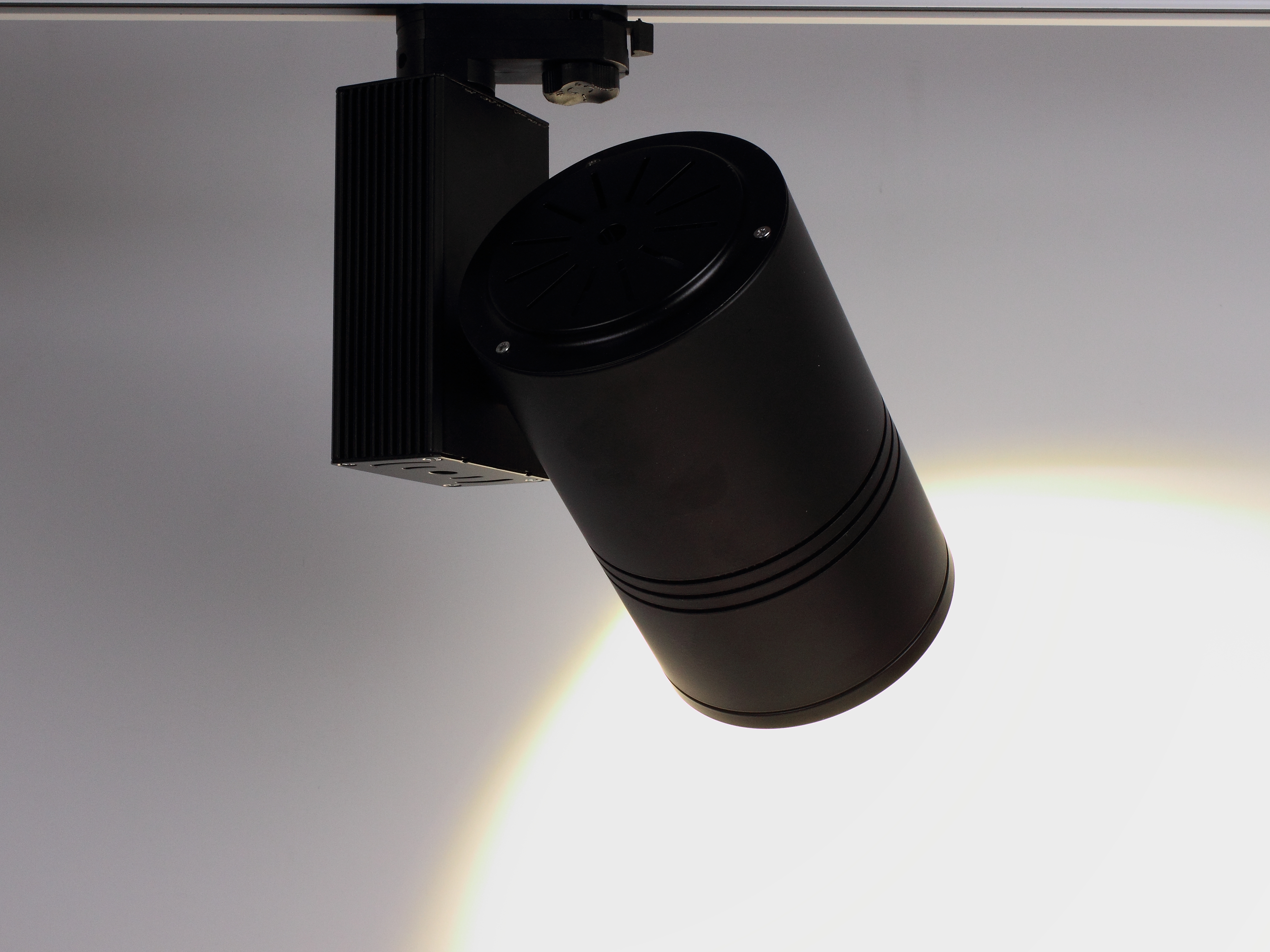 Трековый светильник. Черный корпус. Технология COB. Напряжение 85-265V, мощность 30W, цвет свечения дневной белый 4000K, световой поток 3000Lm. Угол свечения 30 градусов. Класс защиты IP40. Устанавливается на четырехпроводной шинопровод. Возможность подключения до трех групп светильников на одном трековом шинопроводе. Размеры 190x180x200мм. Вес 1100гр.