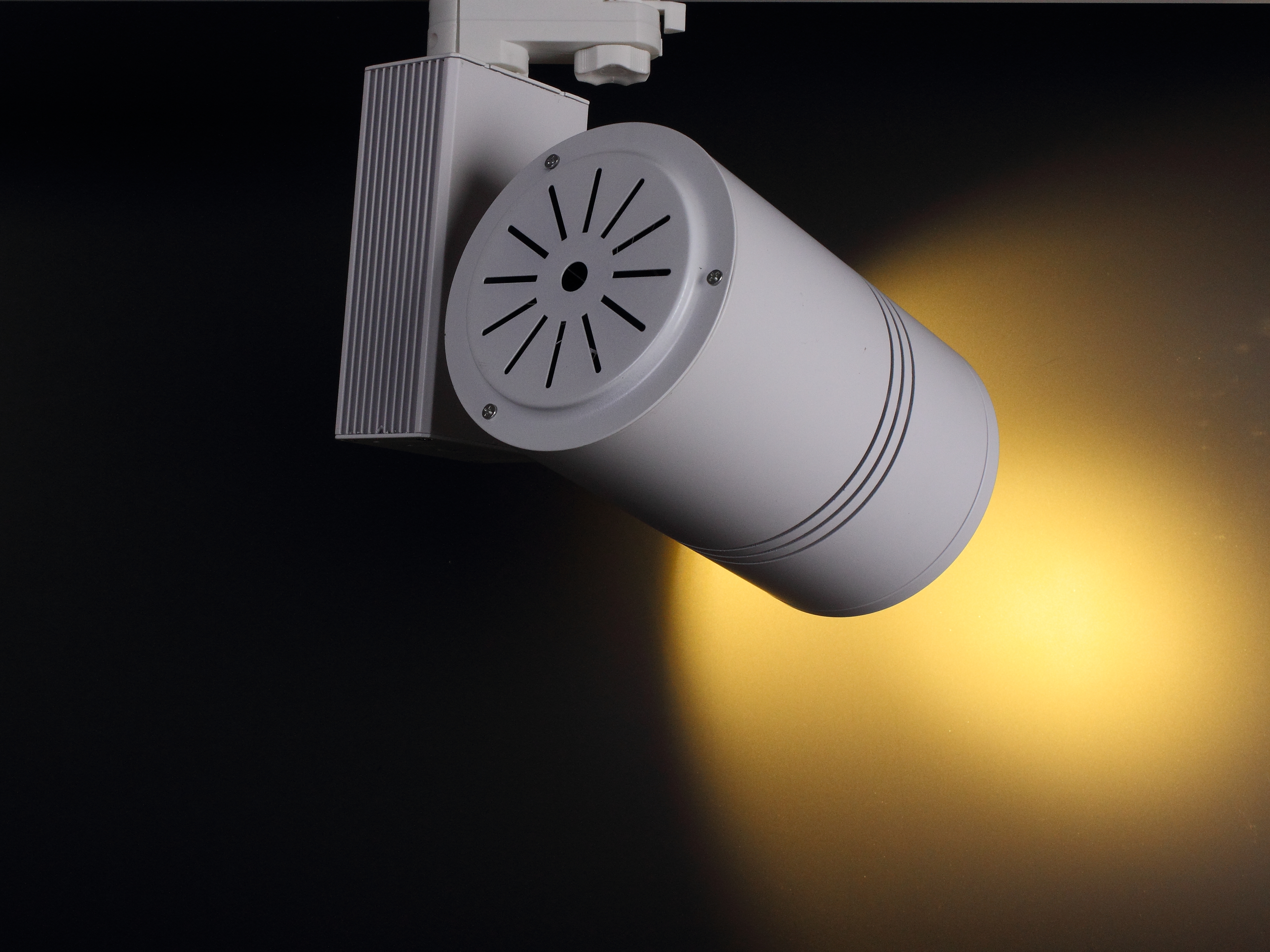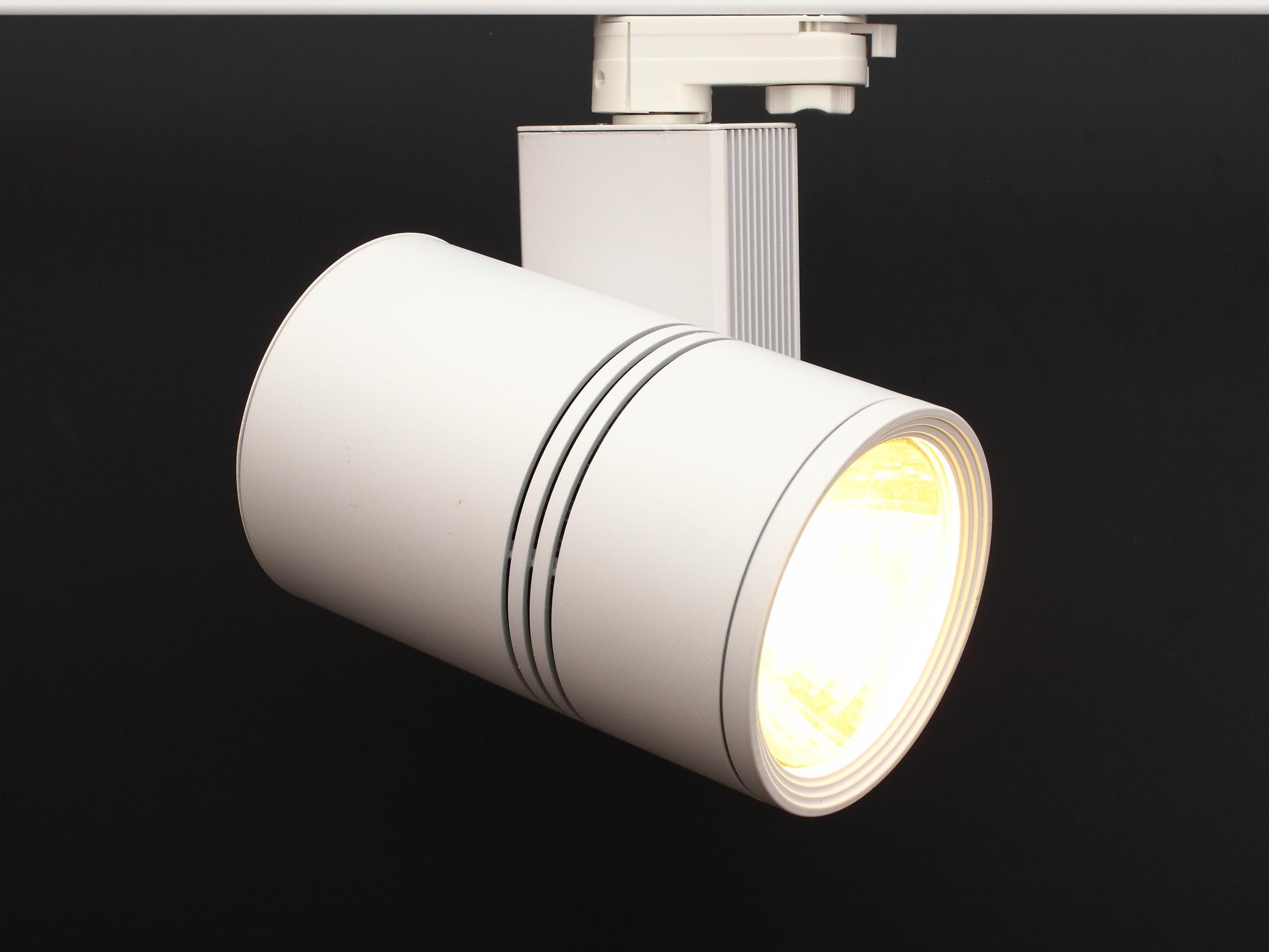 Трековый светильник. Белый корпус. Технология COB. Напряжение 85-265V, мощность 30W, цвет свечения теплый белый 3000K, световой поток 3000Lm. Угол свечения 30 градусов. Класс защиты IP40. Устанавливается на четырехпроводной шинопровод. Возможность подключения до трех групп светильников на одном трековом шинопроводе. Размеры 190x180x200мм. Вес 1100гр.