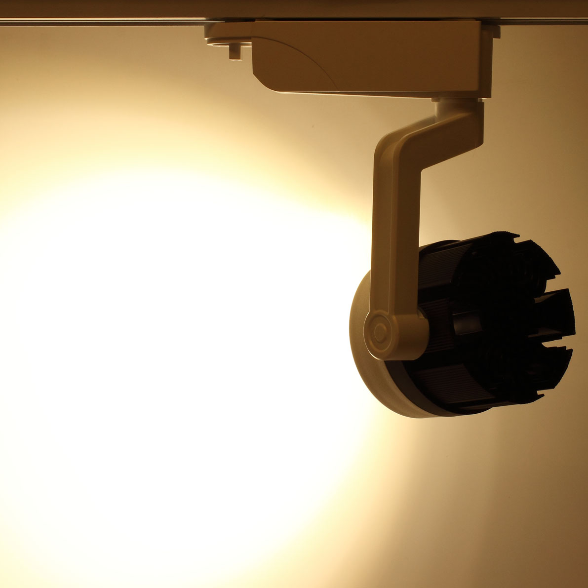 Светодиодный трековый светильник. Черно-белый корпус. Напряжение 85-265V, мощность 20W, цвет свечения теплый белый 3000-3500K, световой поток 1800Lm. Регулируемый угол свечения 15-60 градусов. Класс защиты IP40. Размеры 160x120x210мм. Вес 590г.