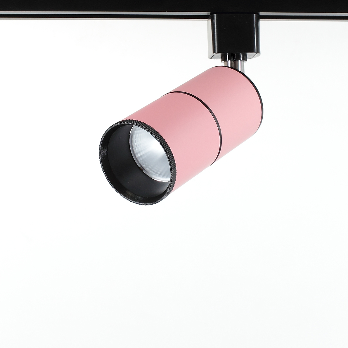Светодиодный трековый светильник. Розовый корпус. Напряжение 85-265V, мощность 10W, цвет свечения дневной белый 4000-4500K, световой поток 700Lm. Угол свечения 24 градусов. Класс защиты IP40. Высота 120мм, диаметр 60мм. Размеры упаковки 65x65x210мм. Вес 280г