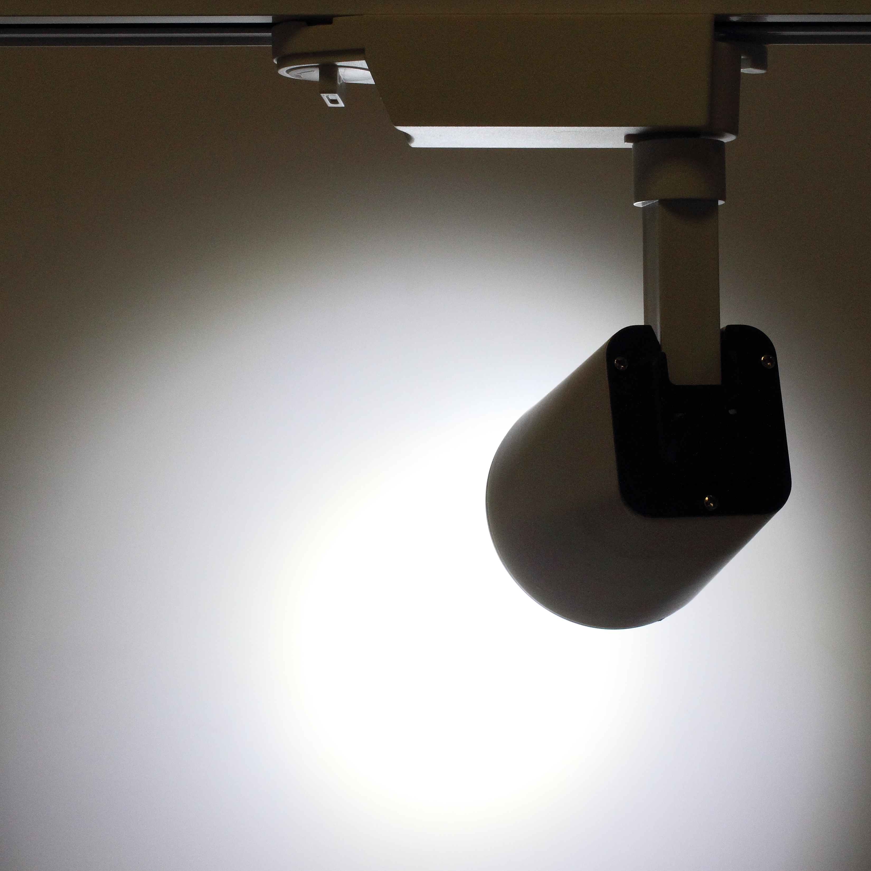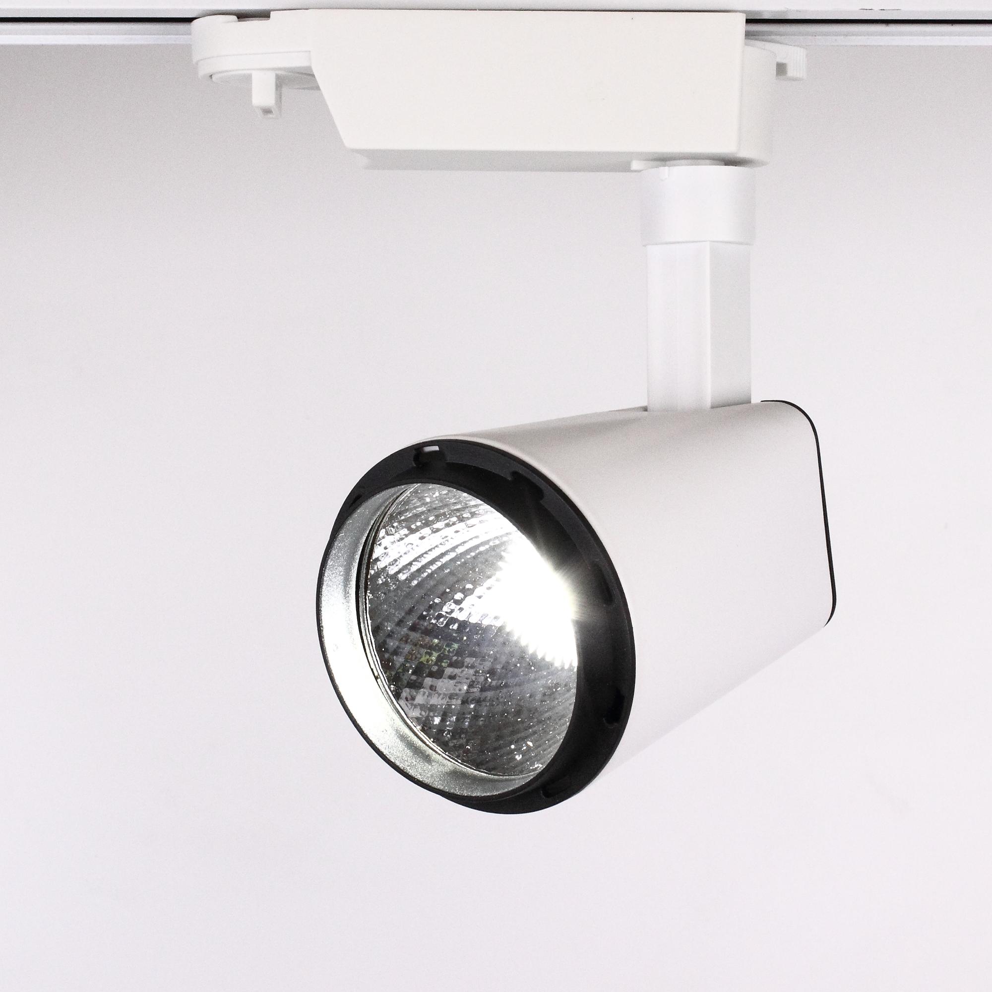 Трековый светильник. Белый корпус с черными вставками. Технология COB. Напряжение 85-265V, мощность 10W, цвет свечения белый 6000K, световой поток1000Lm. Угол свечения 30 градусов. Класс защиты IP20. Размеры 170x70x160мм