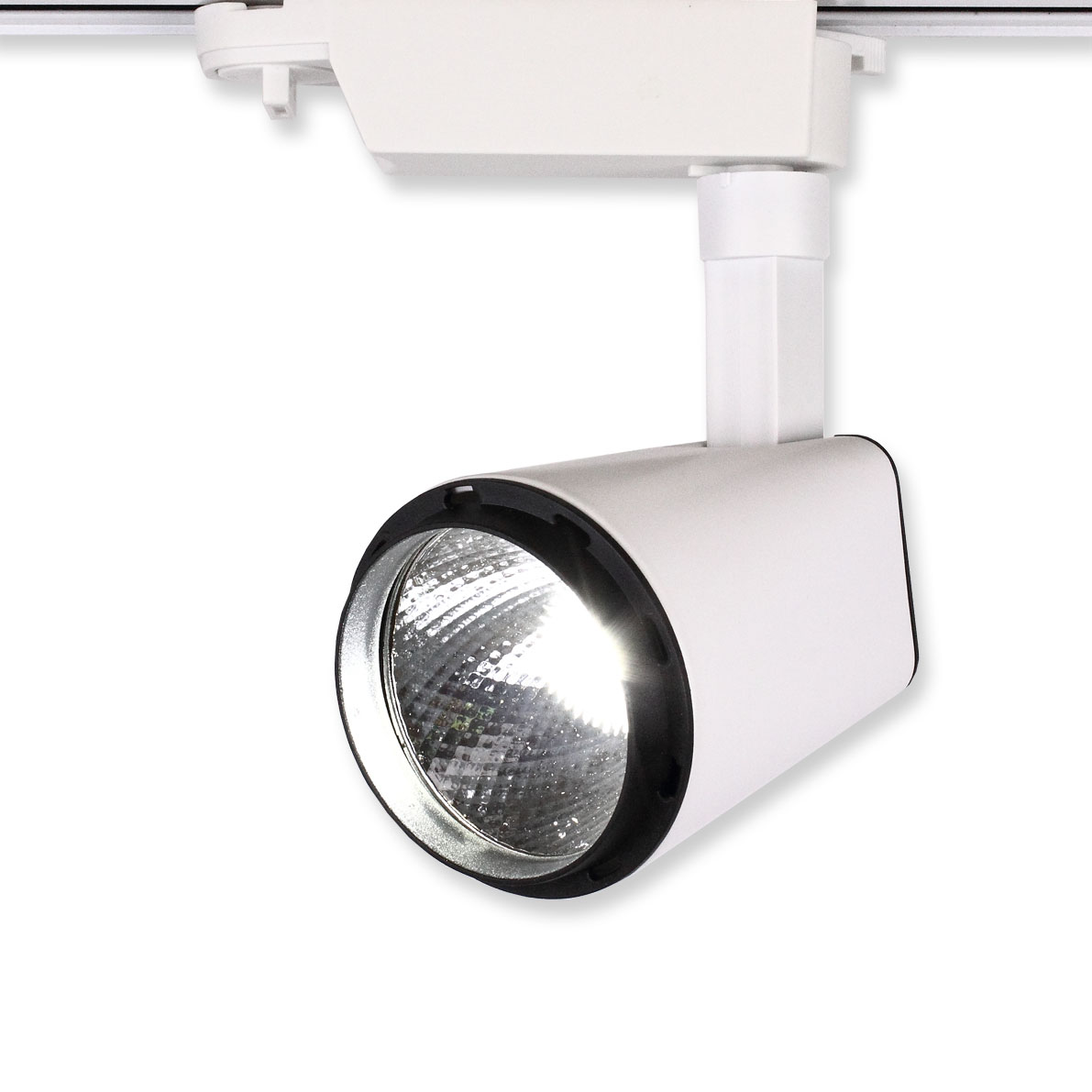 Трековый светильник. Белый корпус. Технология COB. Напряжение 85-265V, мощность 10W, цвет свечения теплый белый 3000K, световой поток1000Lm. Угол свечения 45 градусов. Класс защиты IP20. Размеры 170x70x160мм