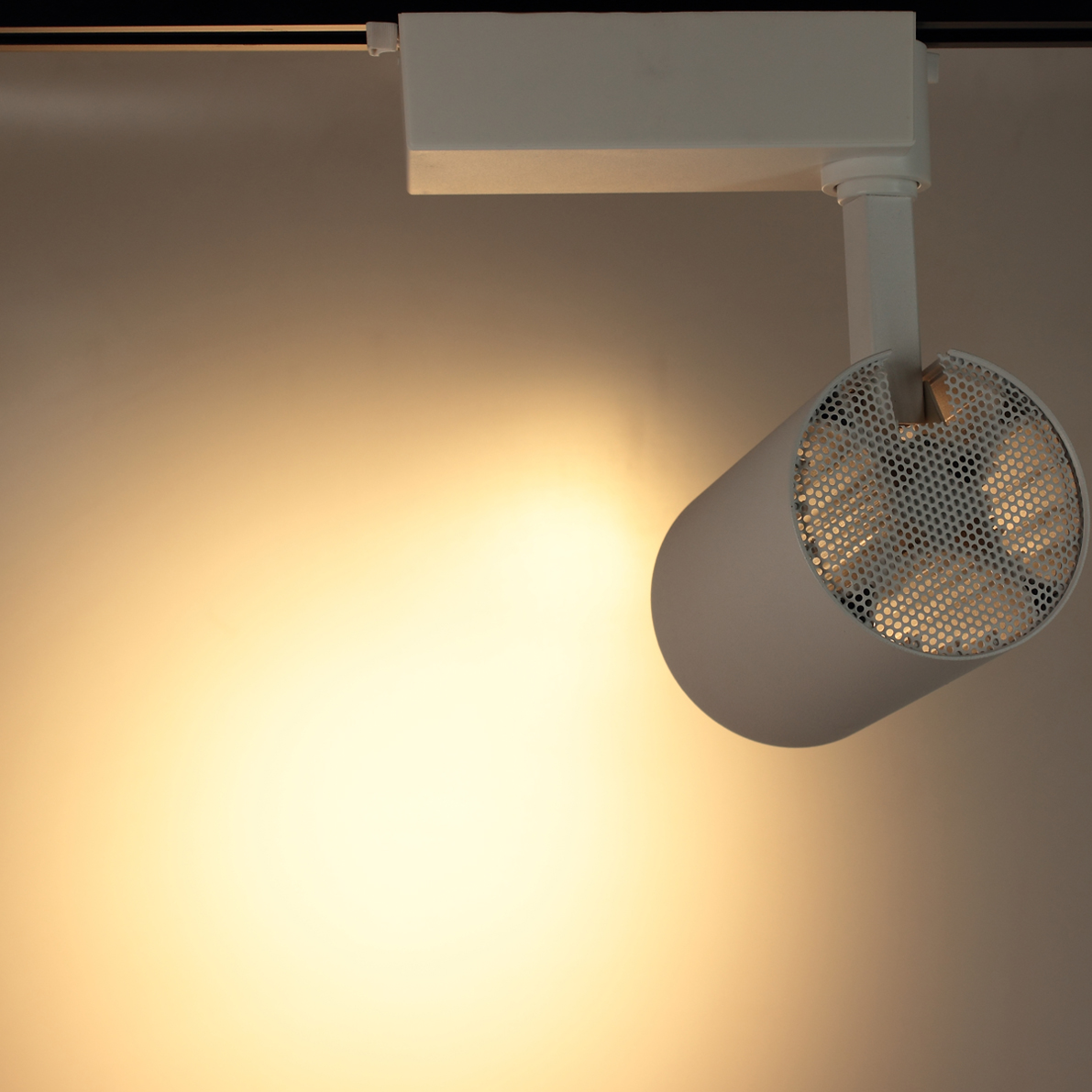 Светодиодный трековый светильник. Белыйй корпус. Напряжение 85-265V, мощность 30W, цвет свечения теплый белый 3000-3500K, световой поток 3000Lm. Угол свечения 30 градусов. Класс защиты IP40. Высота 160мм, диаметр 95мм. Размеры упаковки 220x220x100мм. Вес 1150г
