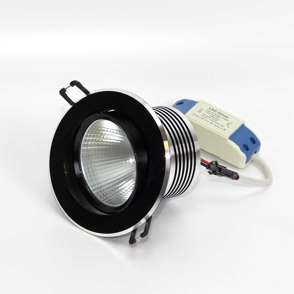 Светодиодный светильник. Круглый черный корпус. Напряжение 100-265V, мощность 10W, цвет свечения дневной белый 4000-4500K, световой поток 1200Lm, угол свечения 60 градусов. Диаметр 110мм, высота 75мм. Установочный диаметр 95мм.