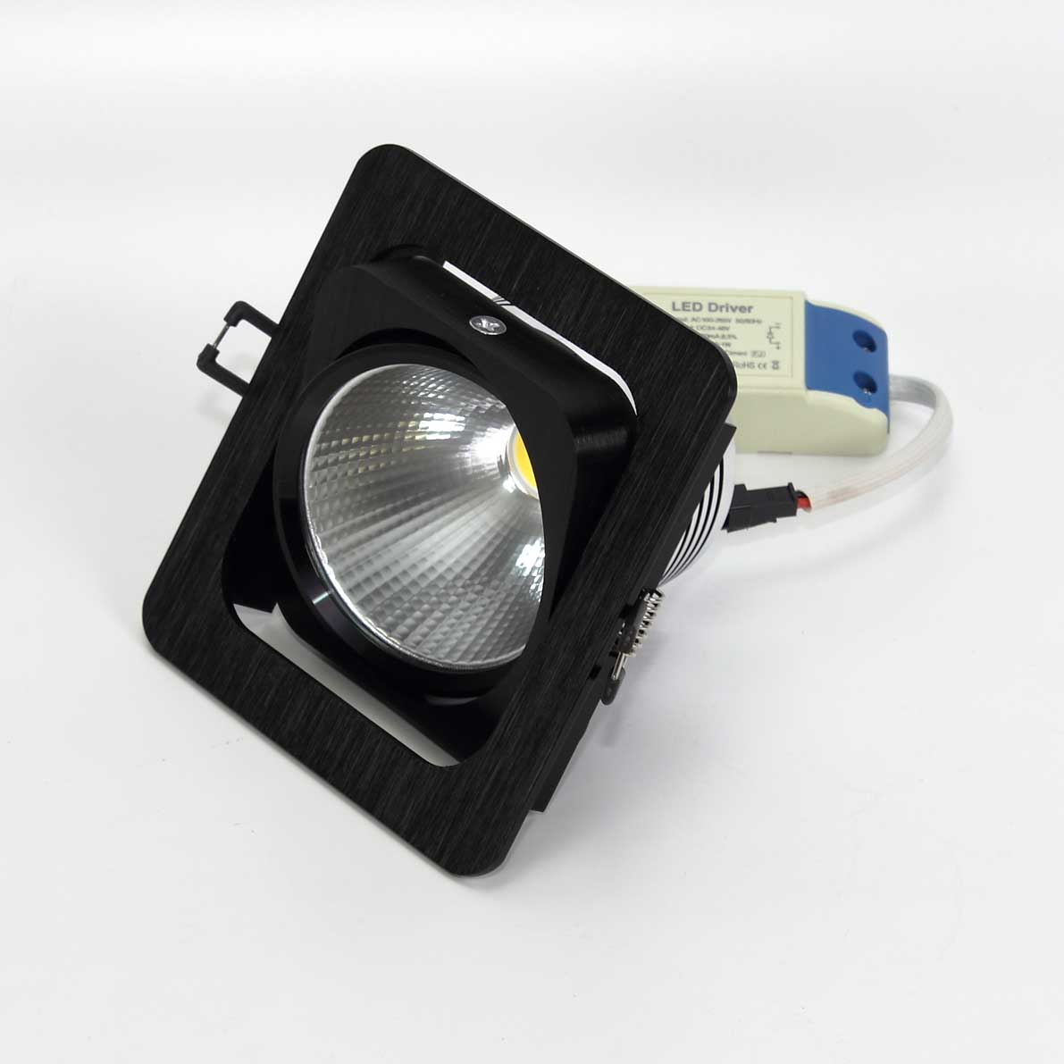 Светодиодный светильник. Квадратный черный корпус. Напряжение 100-265V, мощность 10W, цвет свечения дневной белый 4000-4500K, световой поток 1200Lm, угол свечения 60 градусов. Размер 120х120х80мм. Установочный размер 105х105мм.
