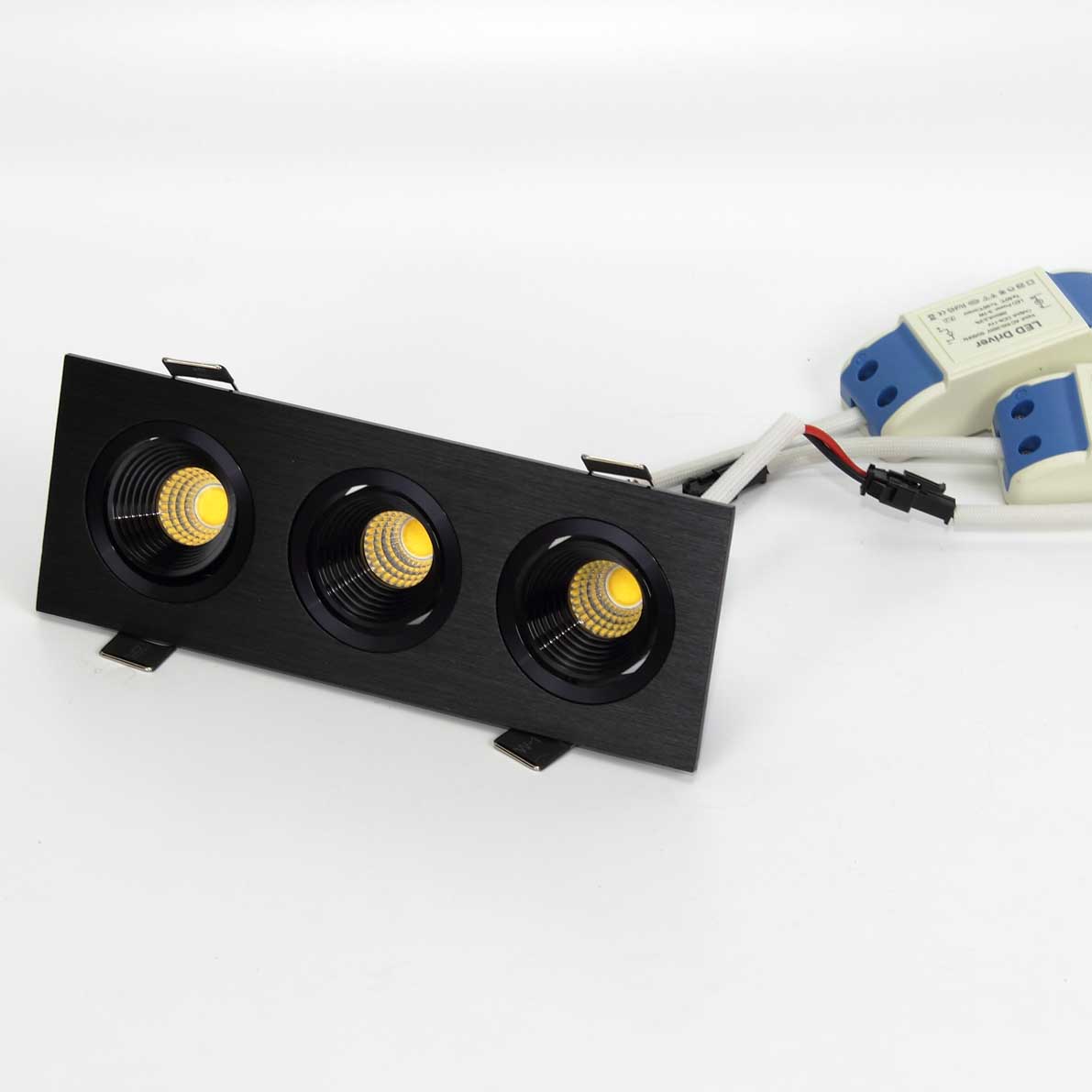 Светодиодный светильник. Квадратный черный корпус. Напряжение 100-265V, мощность 3х3W, цвет свечения дневной белый 4000-4500K, световой поток 1080Lm, угол свечения 60 градусов. Размер 173х65х50мм. Установочный размер 160х60мм.