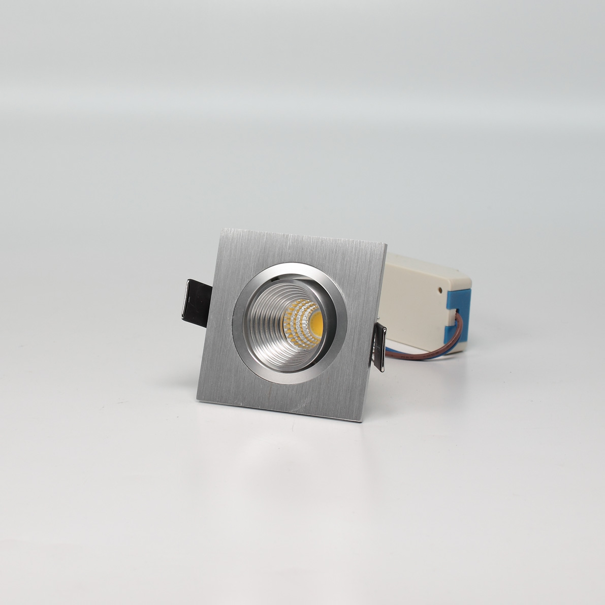 Светодиодный светильник. Квадратный серебрянный корпус. Напряжение 100-265V, мощность 3W, цвет свечения дневной белый 4000-4500K, световой поток 360Lm, угол свечения 60 градусов. Размер 65х65х45мм. Установочный размер 57х50мм. Комплектуется драйвером 8-11В, 280мА. Вес 130г.