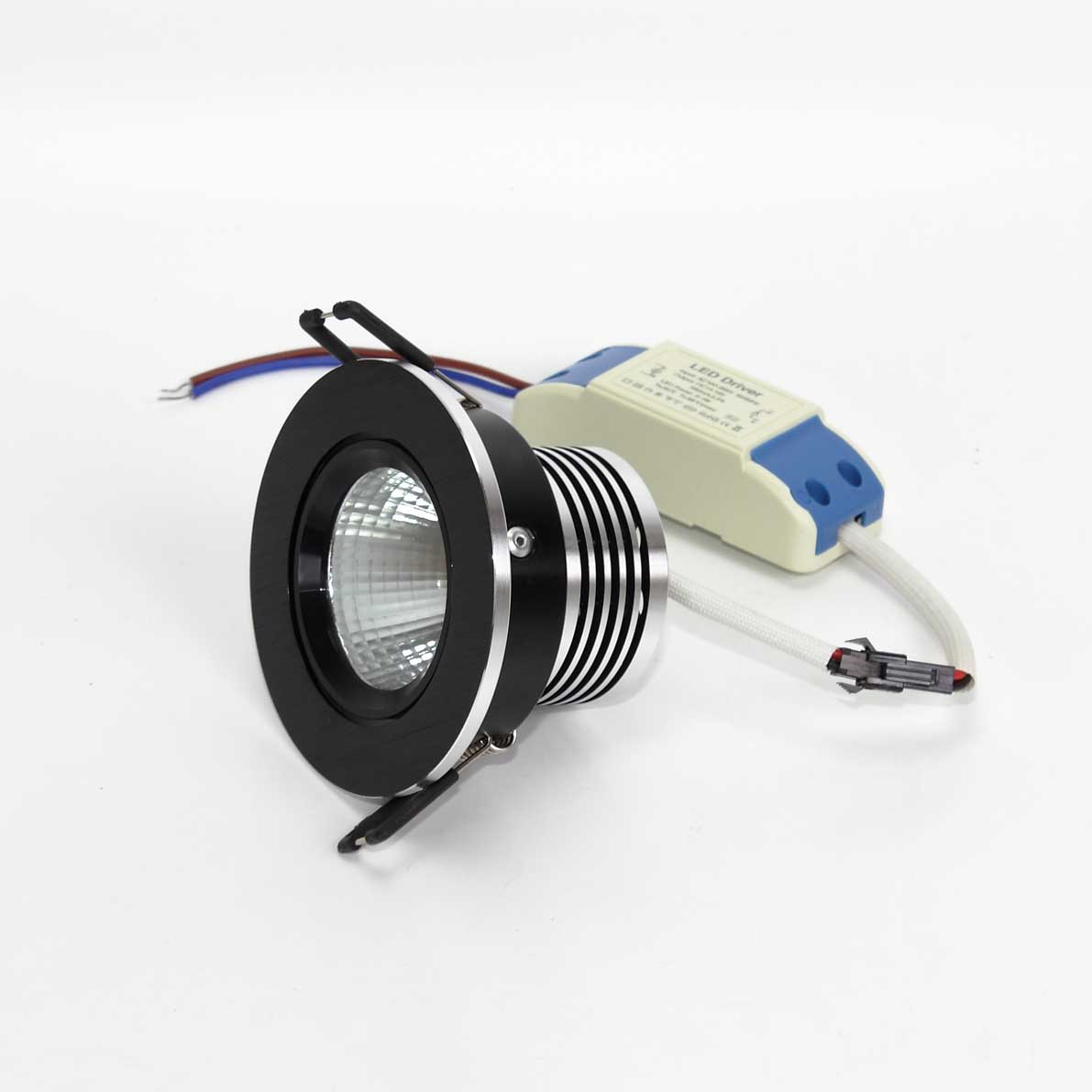 Светодиодный светильник. Круглый черный корпус. Напряжение 100-265V, мощность 5W, цвет свечения дневной белый 4000-4500K, световой поток 600Lm, угол свечения 60 градусов. Диаметр 86мм, высота 65мм. Установочный диаметр 75мм.