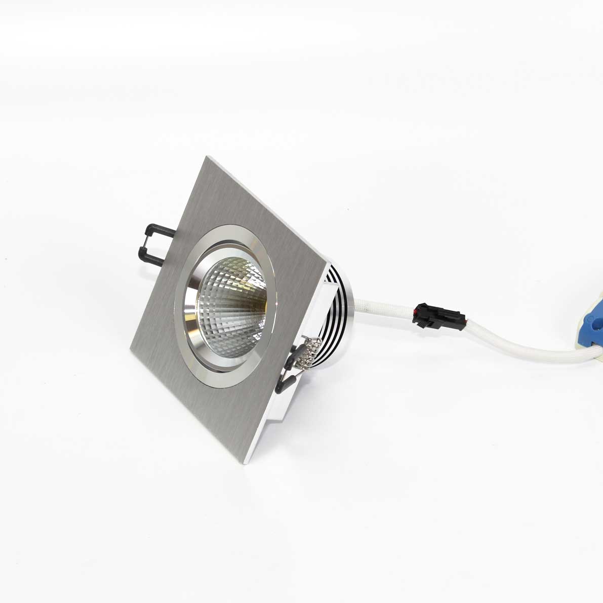 Светодиодный светильник. Квадратный серебристый корпус. Напряжение 100-265V, мощность 5W, цвет свечения дневной белый 4000-4500K, световой поток 600Lm, угол свечения 60 градусов. Размер 98х98х60мм. Установочный размер 85х75мм.