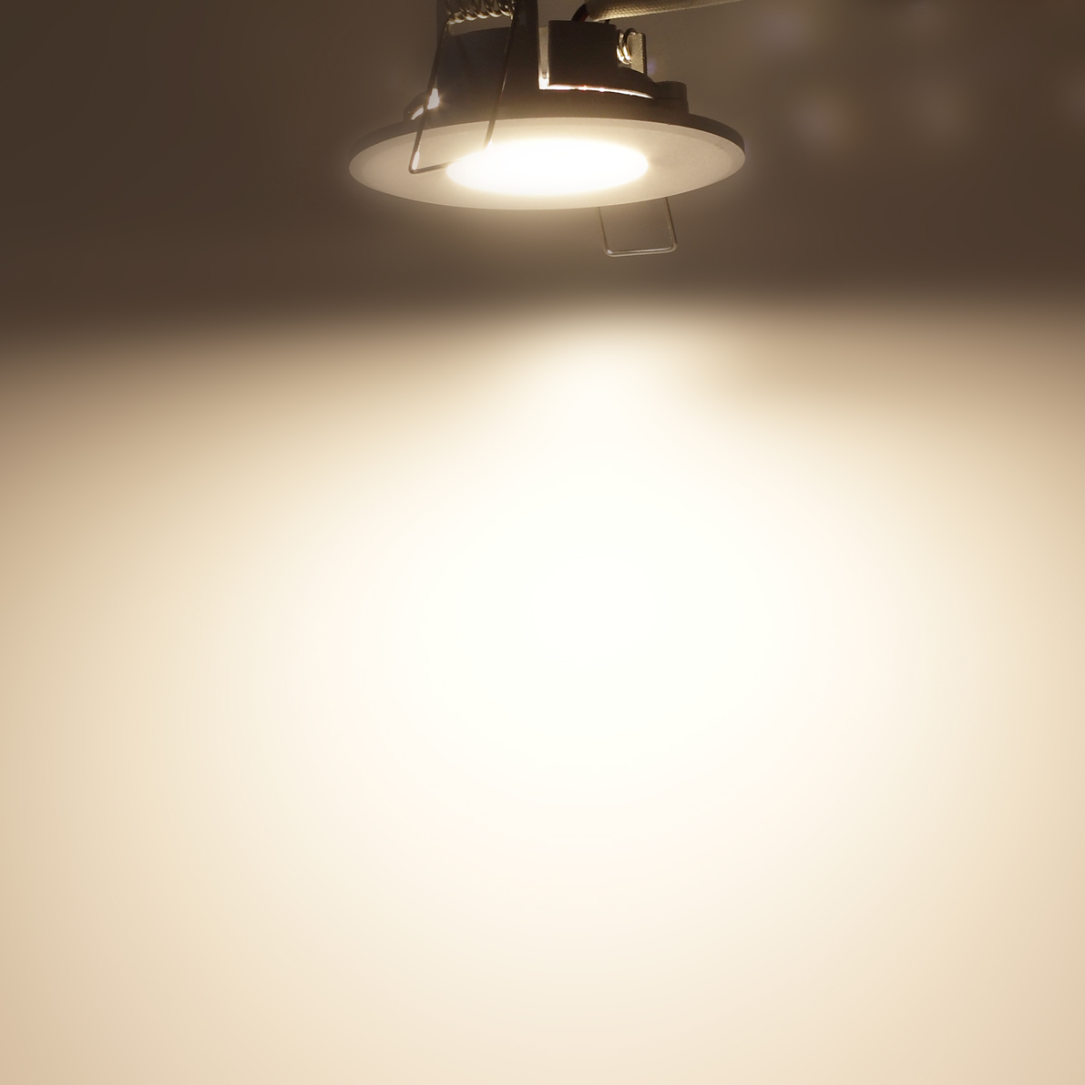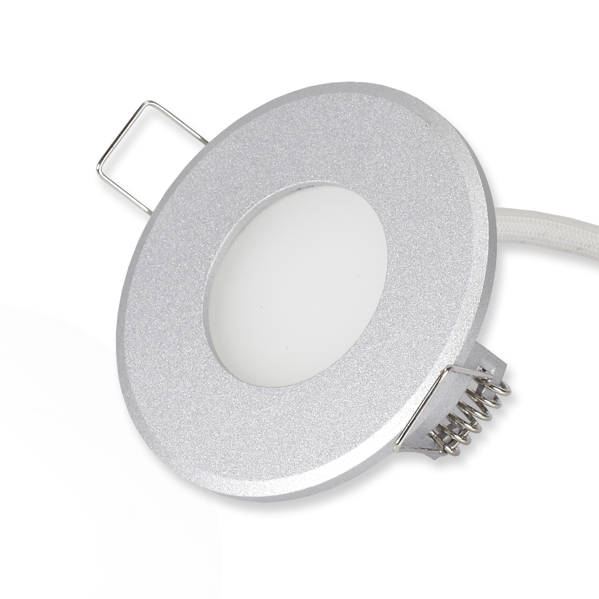 Потолочный светодиодный светильник. Круглый серебристый корпус. Напряжение 220V, мощность 5W, цвет свечения теплый белый 3000-3200K, световой поток 420Lm, диаметр 82мм, коэффициент CRI>80. Установочный диаметр 65мм.