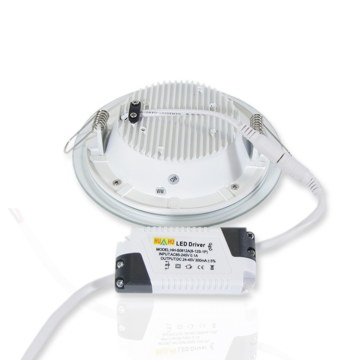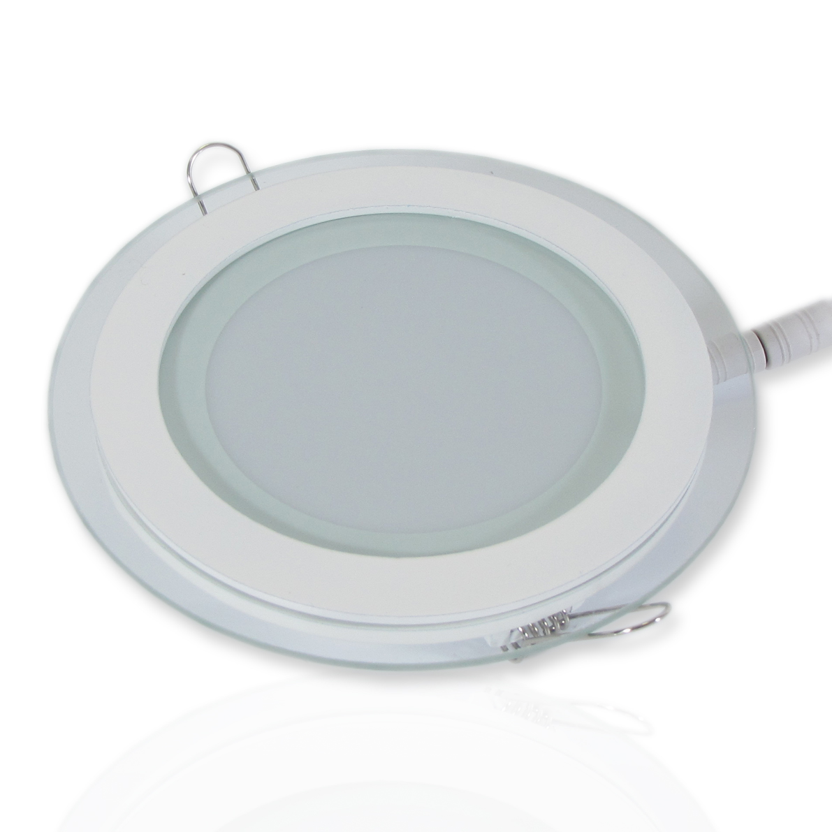 Потолочный светодиодный светильник с декоративным стеклом. Круглый белый корпус с прозрачной стеклянной рамкой. Диаметр 160мм (под отверстие 125мм). Напряжение 220V, мощность 12W, цвет свечения теплый белый 3000-3200K, световой поток 900Lm.