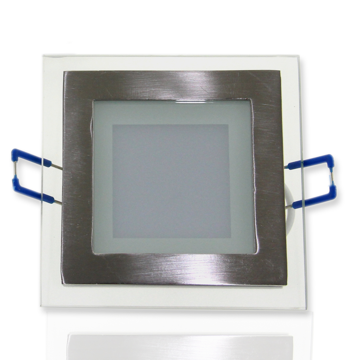 Потолочный светодиодный светильник с декоративным стеклом. Квадратный серебристый корпус с прозрачной стеклянной рамкой. Диаметр 100x100мм (под отверстие 79x79мм). Напряжение 220V, мощность 6W, цвет свечения теплый белый 3000-3200K, световой поток 310Lm.