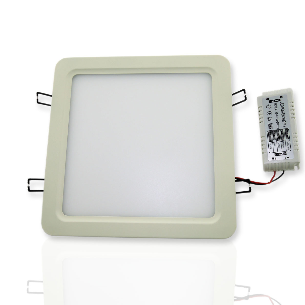 Ультратонкий светодиодный светильник. Тип светодиода NICHIA, с возможностью диммирования, керамический белый корпус, квадрат 250x250мм (под отверстие 230мм). Напряжение 220V, мощность 20W, цвет свечения теплый белый 3200K, световой поток 2000Lm, коэффициент CRI>80.