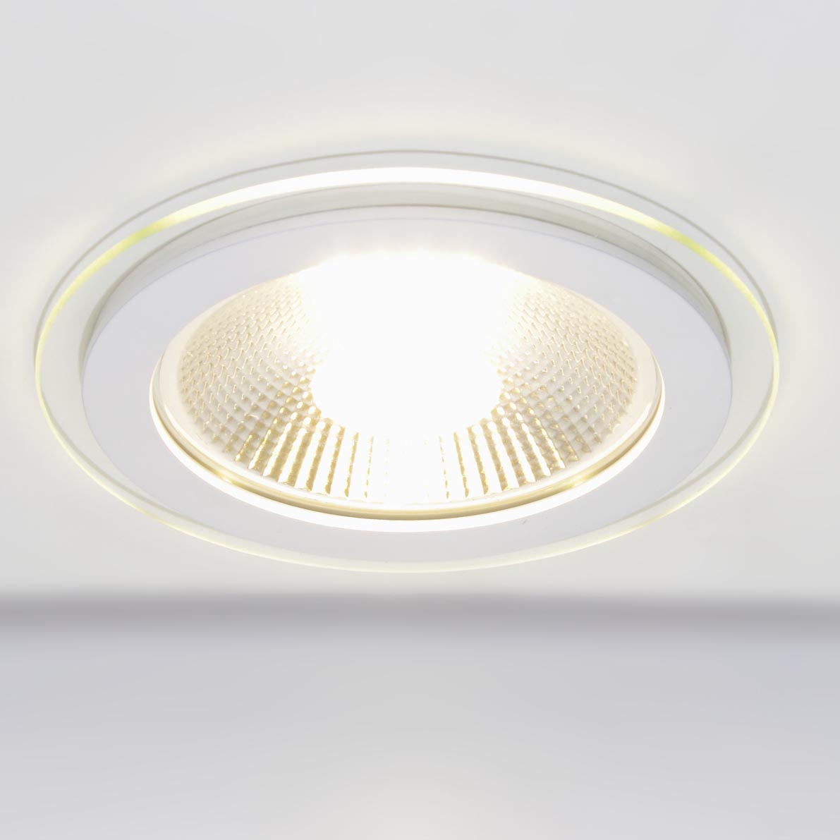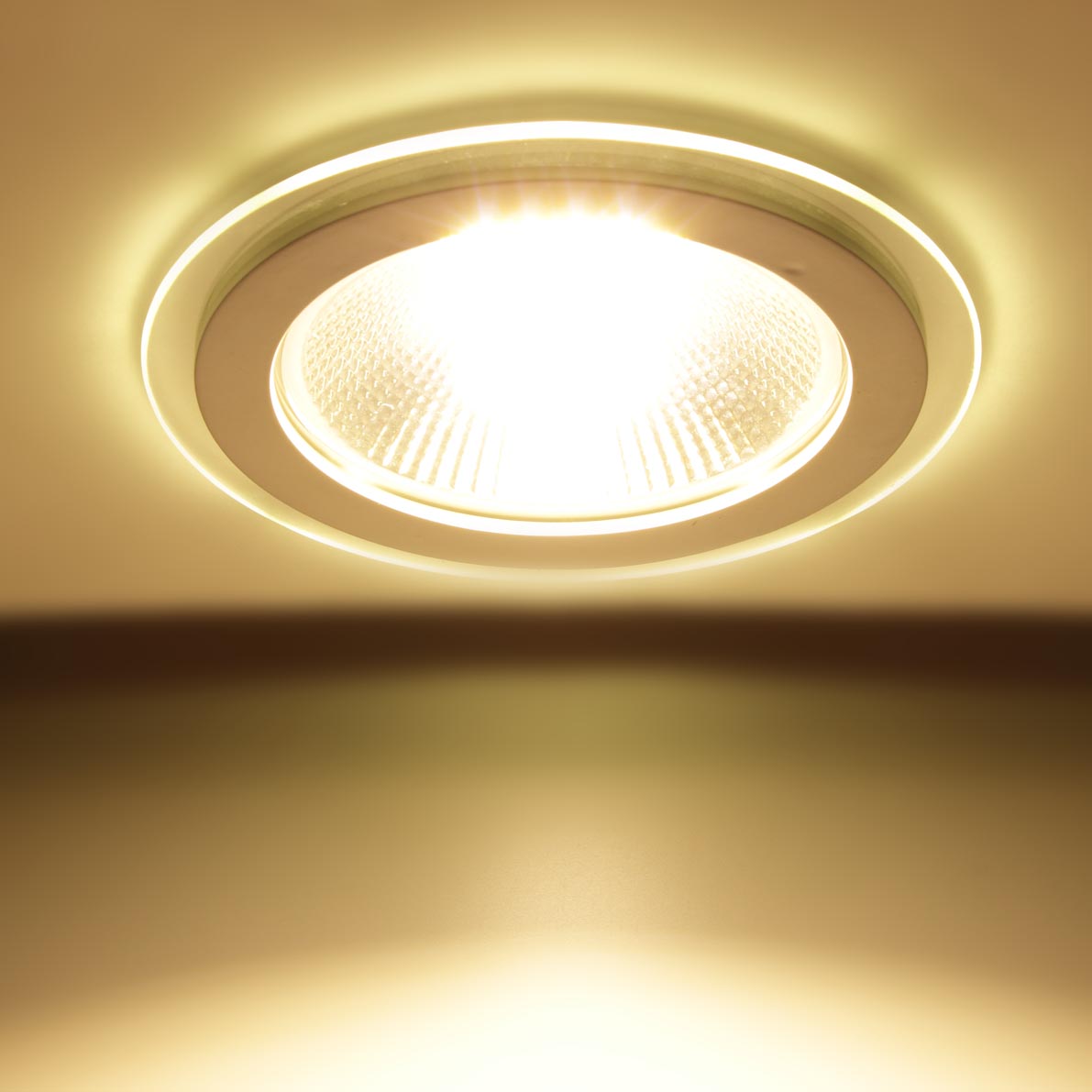 Потолочный светодиодный светильник с декоративным стеклом. Круглый белый корпус с прозрачной стеклянной рамкой. Диаметр 160мм (под отверстие 125мм). Напряжение 85-265V, мощность 10W, цвет свечения теплый белый 3000K, световой поток 1000Lm, угол свечения 90 градусов.