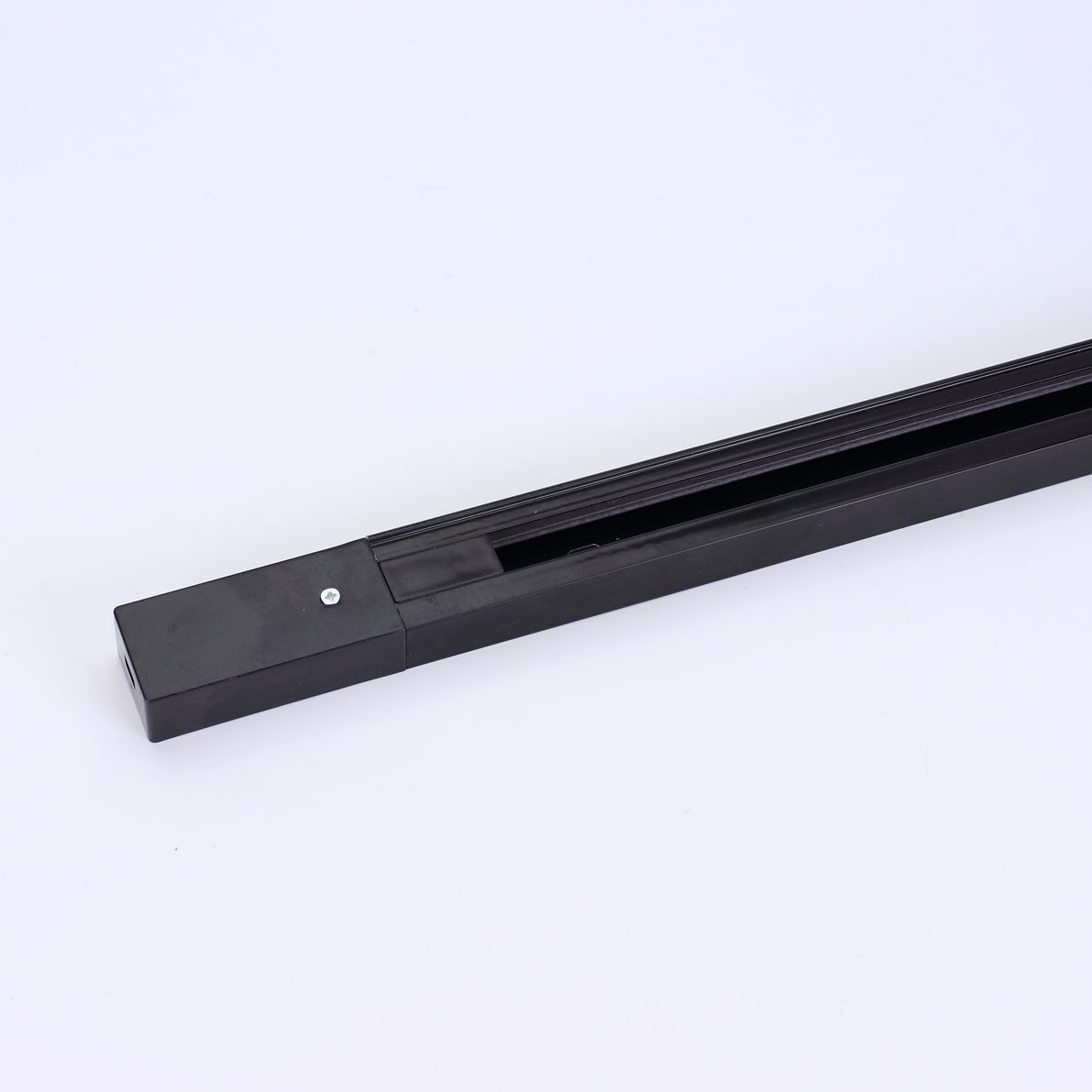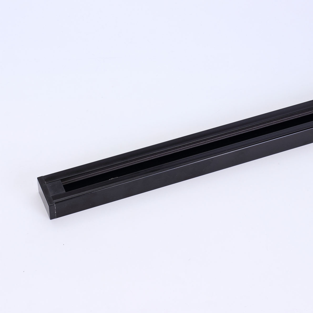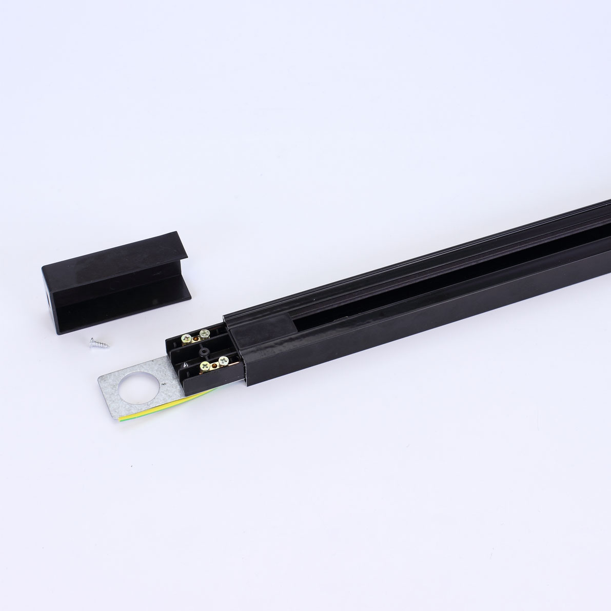 Трек для спотов. Корпус черный. Однофазный, два провода (фаза, ноль), корпус трека заземляется. Размеры 2000х35х20мм. Вес 550г.
