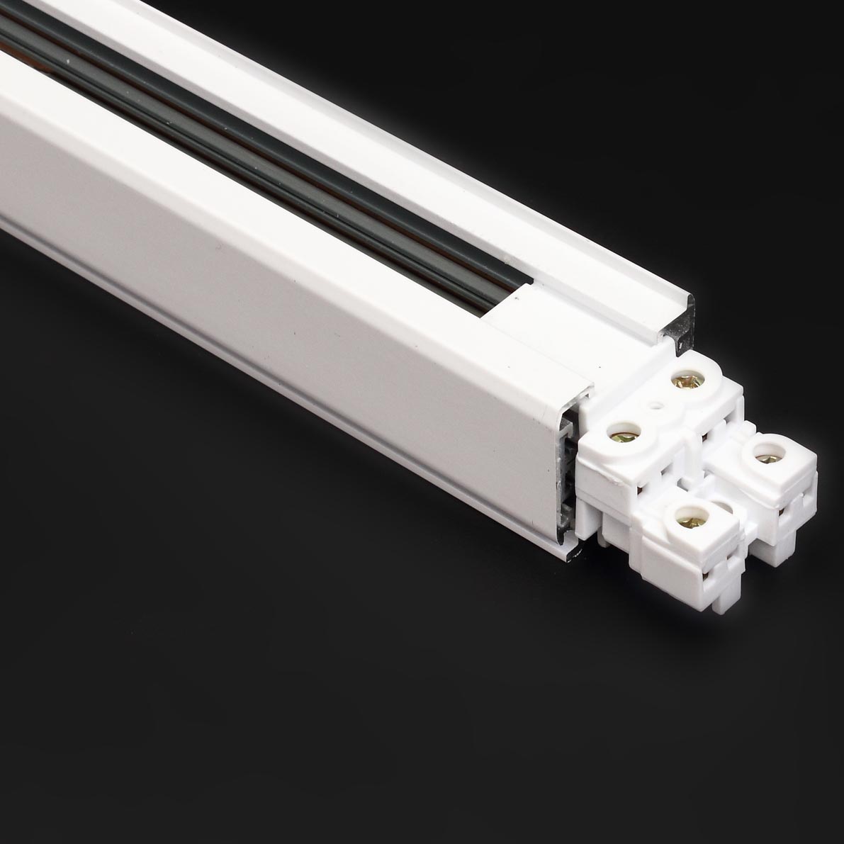 Трек для спотов ''трехфазный'', четыре провода. Корпус белый. Заземление трека и светильника. Возможность подключения до трех групп светильников на одном трековом шинопроводе. Размеры 1000х32,5х36мм. Вес 820г.