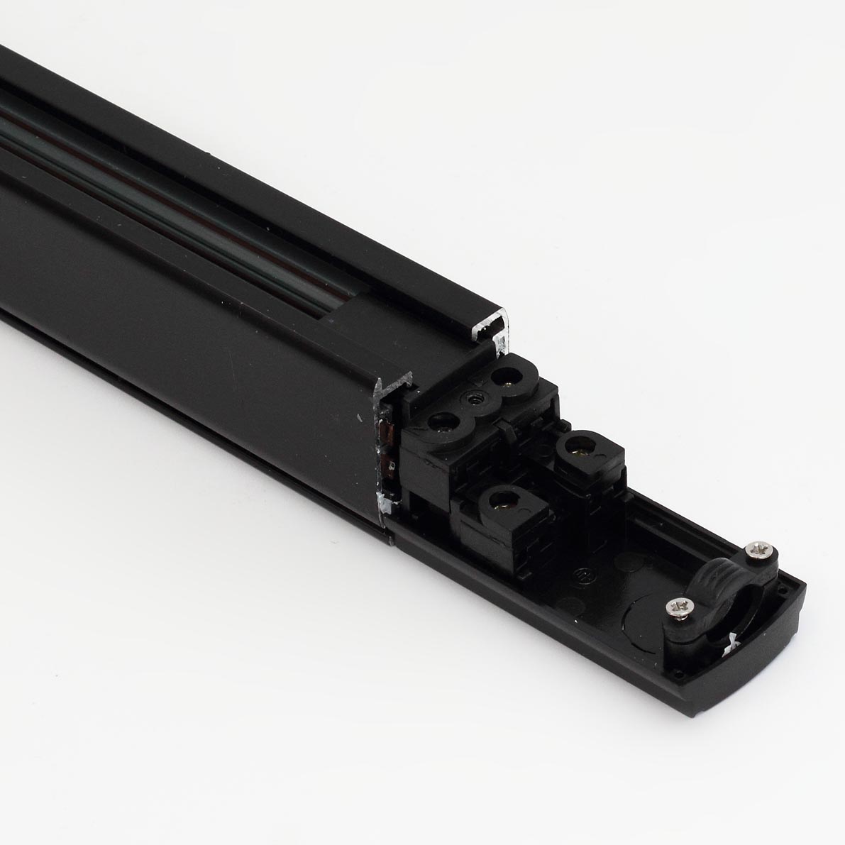 Трек для спотов ''трехфазный'', четыре провода. Корпус черный. Заземление трека и светильника. Возможность подключения до трех групп светильников на одном трековом шинопроводе. Размеры 1000х32,5х36мм. Вес 820г.