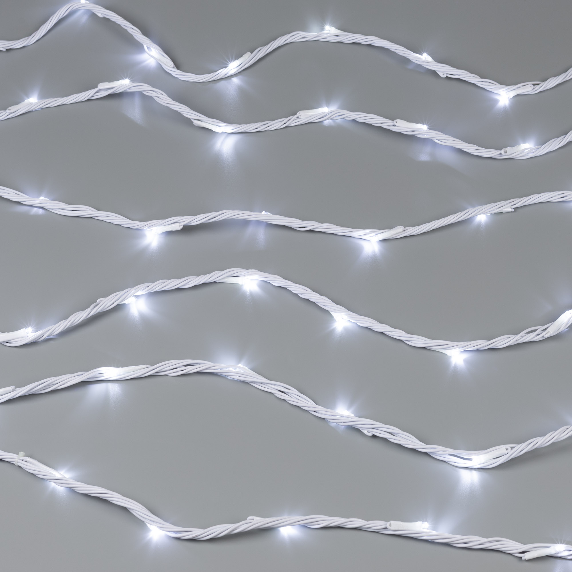 Светодиодная нить Home. Размер 10000 мм. Цвет свечения БЕЛЫЙ (6000 К). 99 светодиодов размером 5 мм с динамическими и статическими эффектами свечения с резким световым рисунком (прозрачная вогнутая линза). Эффект "Бегущий огонь" по всей длине нити, смена эффектов и управление осуществляется с помощью контроллера с пультом. Провод белый, ПВХ. Питание 230 В, Мощность 10.5 Вт, защита IP20, применение в помещении. Аксессуары для подключения и управления в комплекте.