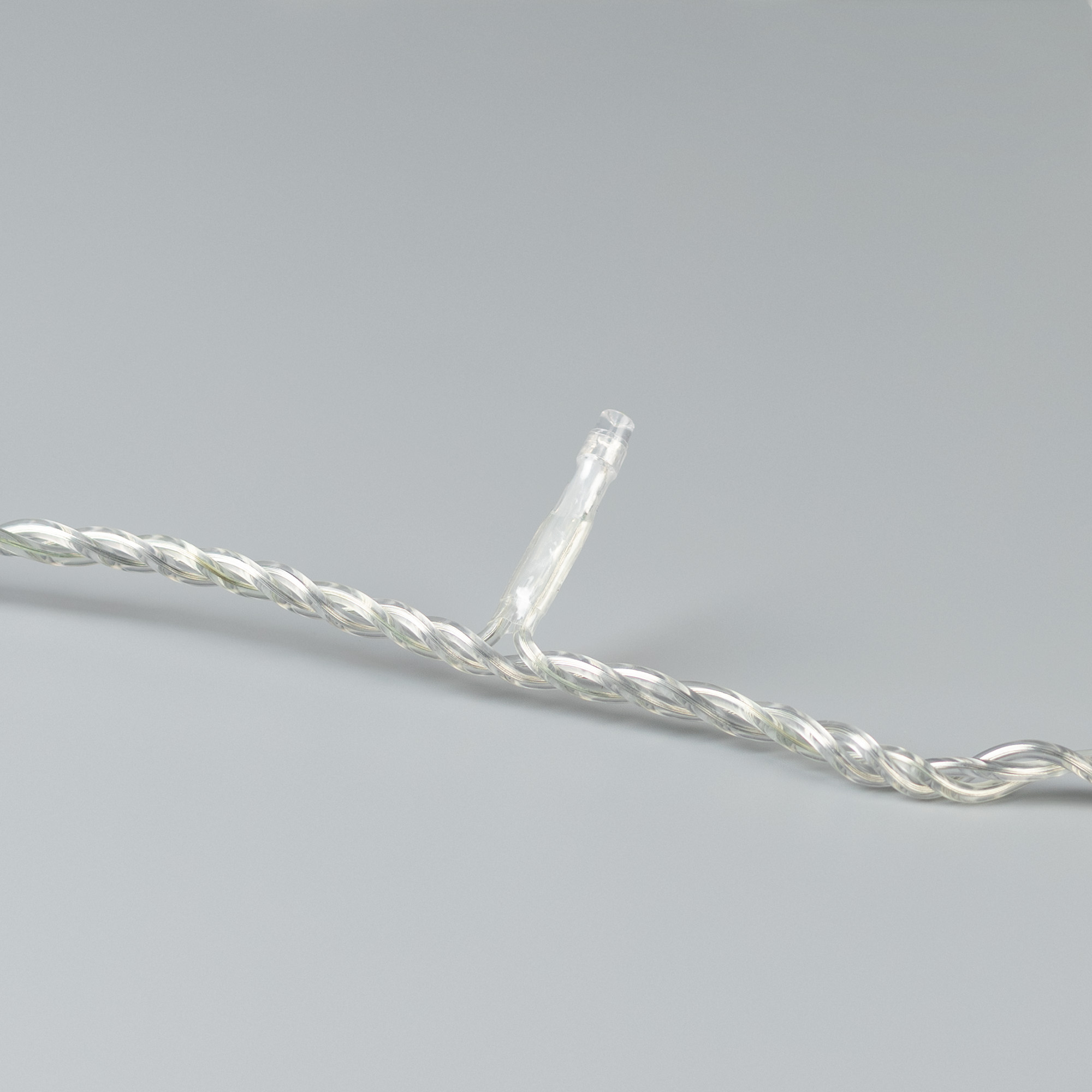Светодиодная нить Home. Размер 5000 мм. Цвет свечения БЕЛЫЙ (6000 К). 50 светодиодов размером 5 мм со статическим эффектом свечения с резким световым рисунком (прозрачная вогнутая линза). Провод прозрачный, ПВХ. Питание 230 В, Мощность 3.5 Вт, защита IP20, применение в помещении. Аксессуар для подключения в комплекте.