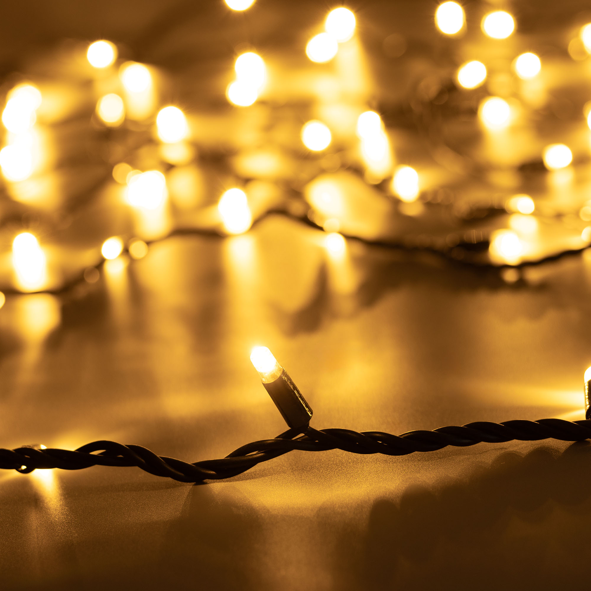 Светодиодная нить Pro. Размер 10000 мм. Цвет свечения ТЕПЛЫЙ БЕЛЫЙ (3000 К). 100 светодиодов размером 7 мм со статическим эффектом свечения с резким световым рисунком (прозрачная вогнутая линза). Провод черный, каучук. Питание 230 В, Мощность 7 Вт, защита IP65, применение в помещении и на улице под навесом. Аксессуары для подключения и управления приобретаются отдельно.