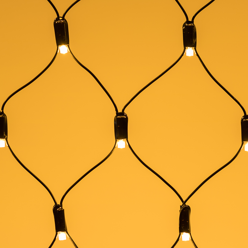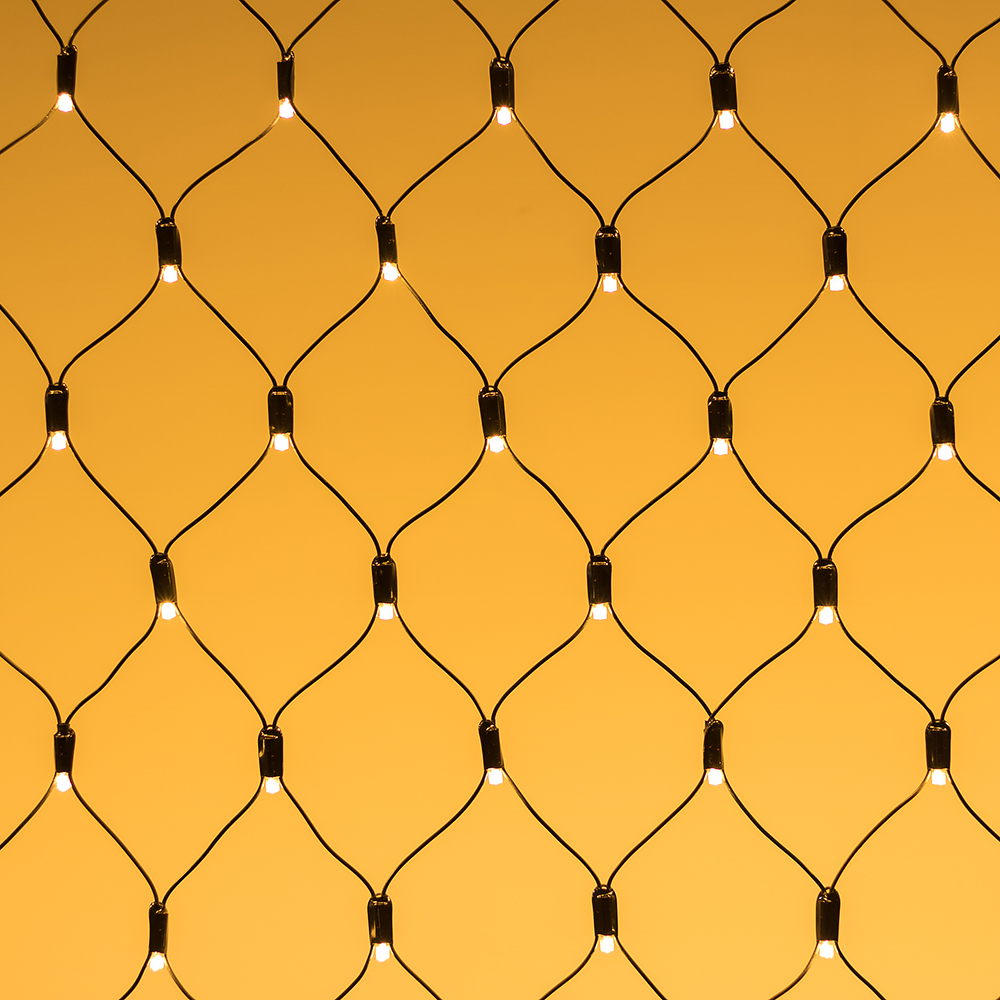 Светодиодная сеть Classic. 2000x1500 (длина 2000 мм, высота 1500 мм). Цвет свечения ТЕПЛЫЙ БЕЛЫЙ (3000 К). 288 светодиодов размером 7 мм со статическим и 8 динамическими эффектами свечения с резким световым рисунком (прозрачная вогнутая линза). Провод черный, ПВХ. Питание 230 В, Мощность 18 Вт,защита IP65, применение в помещении и на улице под навесом Аксессуары для подключения и выбора режима свечения в комплекте.