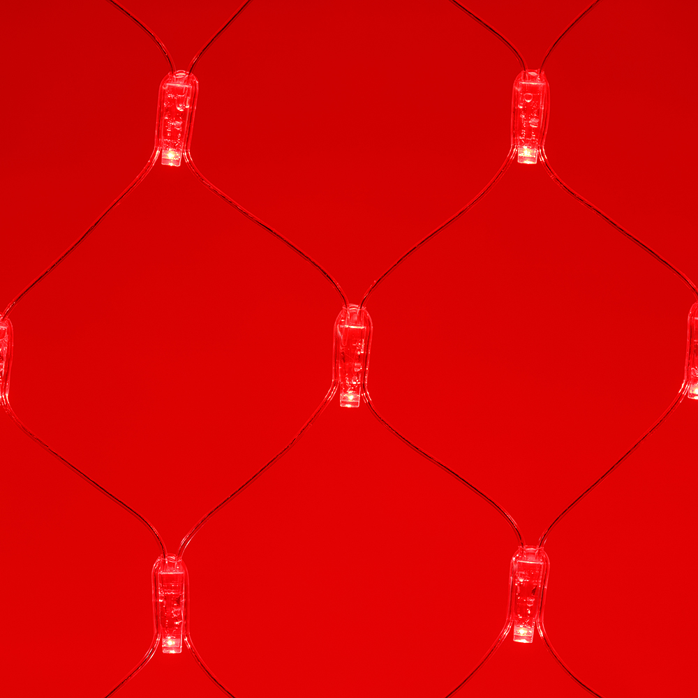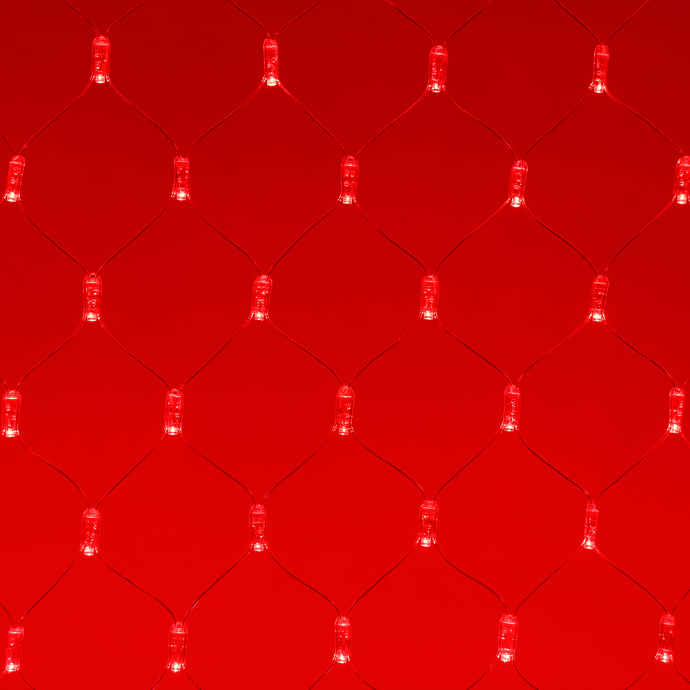 Светодиодная сеть Classic. 2000x1500 (длина 2000 мм, высота 1500 мм). Цвет свечения КРАСНЫЙ. 288 светодиодов размером 7 мм со статическим и 8 динамическими эффектами свечения с резким световым рисунком (прозрачная вогнутая линза). Провод прозрачный, ПВХ. Питание 230 В, Мощность 18 Вт,защита IP65, применение в помещении и на улице под навесом Аксессуары для подключения и выбора режима свечения в комплекте.