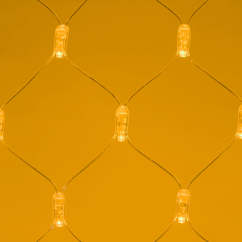 Светодиодная сеть Classic. 2000x1500 (длина 2000 мм, высота 1500 мм). Цвет свечения ЖЕЛТЫЙ. 288 светодиодов размером 7 мм со статическим и 8 динамическими эффектами свечения с резким световым рисунком (прозрачная вогнутая линза). Провод прозрачный, ПВХ. Питание 230 В, Мощность 18 Вт,защита IP65, применение в помещении и на улице под навесом Аксессуары для подключения и выбора режима свечения в комплекте.