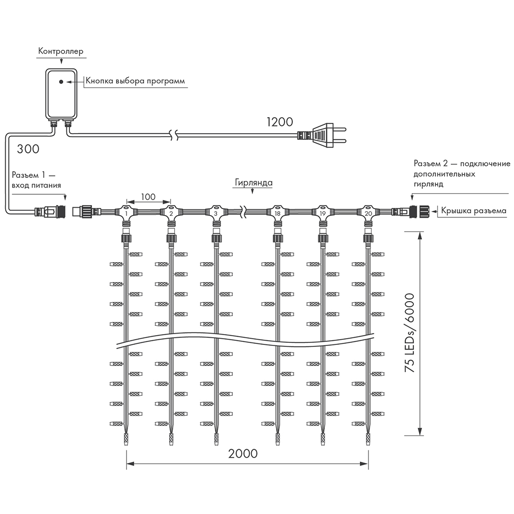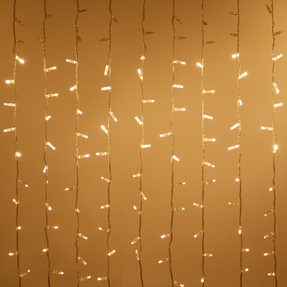 Светодиодный занавес Classic. Размер 2000x6000 мм (длина 2000 мм, высота 6000 мм). 20 ниспадающих нитей длиной 6000 мм. Цвет светодиодов ТЕПЛЫЙ БЕЛЫЙ (3000 К), динамический эффект "водопад". 1500 светодиодов размером 7 мм с резким световым рисунком (прозрачная вогнутая линза). Провод прозрачный, ПВХ. Питание 230 В, Мощность 180 Вт, защита IP65, применение в помещении и на улице под навесом. Аксессуары для подключения в комплекте.