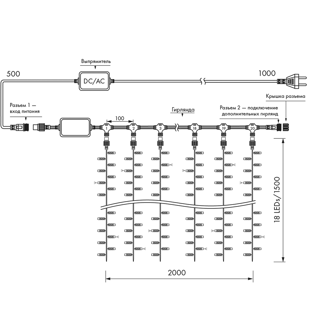 Светодиодный Занавес Classic. Размер 2000x1500 мм (длина 2000 мм, высота 1500 мм). 18 ниспадающих нитей длиной 1500 мм. 360 светодиодов размером 7 мм. Основной цвет свечения ТЕПЛЫЙ БЕЛЫЙ (3000 К), эффект мерцания редких точек БЕЛЫЙ (6000К) с резким световым рисунком (прозрачная вогнутая линза), соотношение светодиодов: 300 теплых постоянного свечения / 60 белых с мерцанием. Эффект частого мерцания. Провод прозрачный, ПВХ. Питание 230 В, Мощность 60 Вт, защита IP65, применение в помещении и на улице под навесом. Аксессуар для подключения и выбора режима свечения в комплекте.