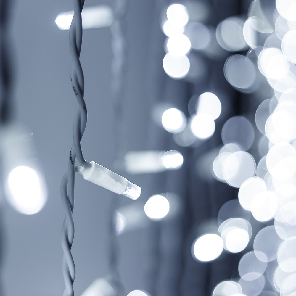 Светодиодный Занавес Pro. Размер 2000x3000 мм (длина 2000 мм, высота 3000 мм). 20 ниспадающих нитей длиной 3000 мм. 760 светодиодов размером 7 мм. Основной цвет свечения БЕЛЫЙ (6000 К), эффект мерцания редких точек БЕЛЫЙ (6000К) с резким световым рисунком (прозрачная вогнутая линза), соотношение светодиодов: 634 белых постоянного свечения / 126 белых с мерцанием. Эффект частого мерцания. Провод белый, каучук. Питание 230 В, Мощность 70 Вт, защита IP65, применение в помещении и на улице под навесом. Аксессуар для подключения и выбора режима свечения в комплекте.