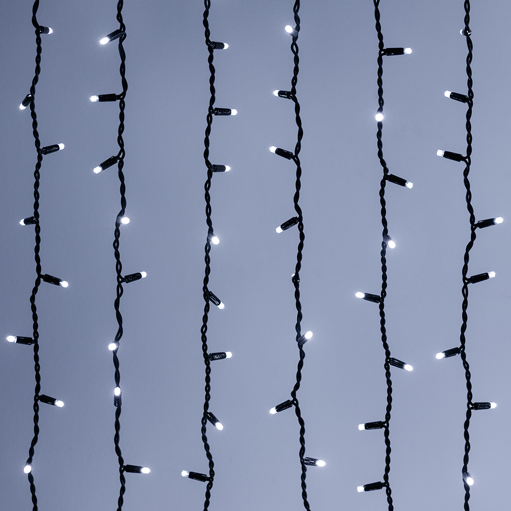 Светодиодный Занавес Pro. Размер 2000x3000 мм (длина 2000 мм, высота 3000 мм). 20 ниспадающих нитей длиной 3000 мм. 760 светодиодов размером 7 мм. Цвет свечения БЕЛЫЙ (6000 К), постоянное свечение и 8 динамических эффектов с резким световым рисунком (прозрачная вогнутая линза). Провод черный, каучук. Питание 230 В, Мощность 70 Вт, защита IP65, применение в помещении и на улице под навесом. Аксессуар для подключения и выбора режима свечения в комплекте.