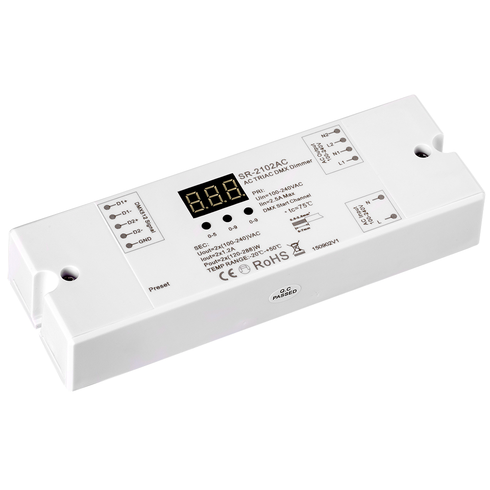 DMX-диммер для галогенных и других ламп на 220В, а также для высоковольтного неона (при использовании стандартного адаптера для подключения неона к сети AC 230V). Коммутируемая мощность макс. 560Вт (2 канала по 1,2А). Адрес DMX задается кнопками на корпусе, индикация адреса. Размер 168x58х28мм. Питание 100-240VAC.