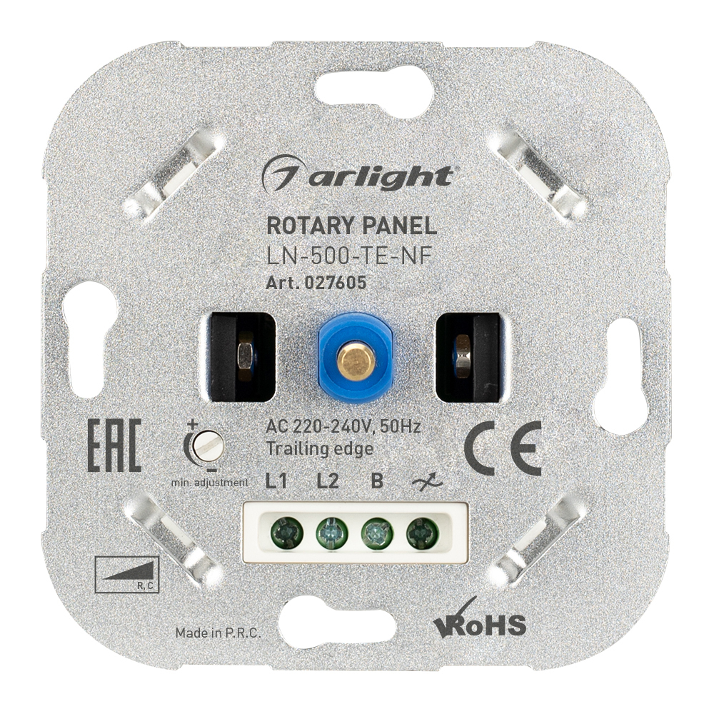 Встраиваемая роторная панель. Для управления одноцветными источниками света (TRIAC). Управление яркостью с помощью роторного вращателя. Работает в режиме Trailing Edge, диммирование по заднему фронту. Не требует подключения N провода. Возможна работа с любым источником света, поддерживающим фазное диммирование. Есть регулировка ограничения минимального уровня яркости. Питание/рабочее напряжение 220-240VAC. Максимальная резистивная нагрузка 500W, минимальная- 5W. Габариты 70х70х47 мм., Декоративная накладка в комплект не входит. Панель совместима с проходными выключателями. Механизм совместим с большинством европейских производителей электроустановочных изделий.