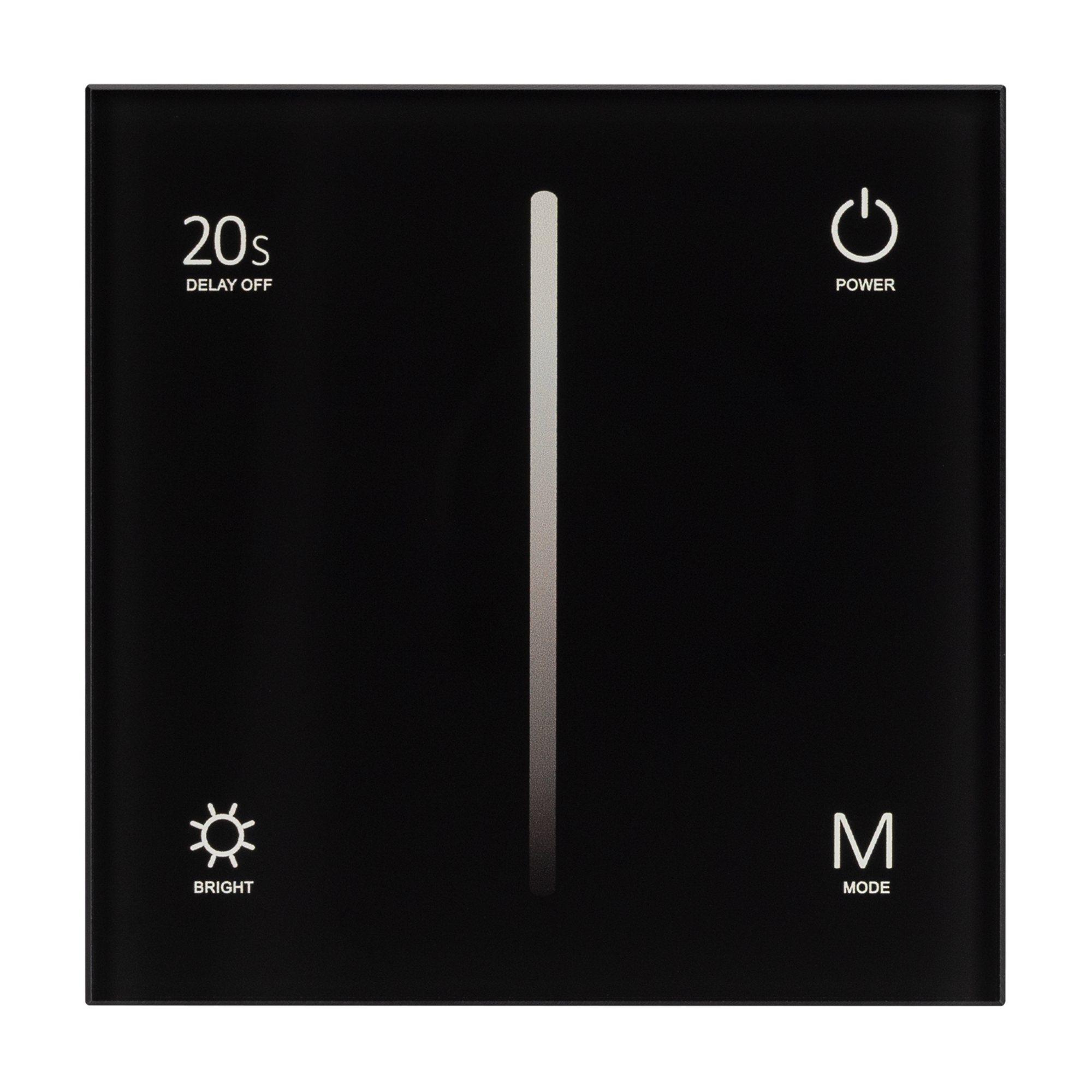 Встраиваемая сенсорная стеклянная панель 2.4 ГГц, цвет чёрный. Для управления одноцветными источниками света (TRIAC). Управление яркостью с помощью сенсорной полосы. Питание/рабочее напряжение 100-240VAC, 1 зона управления. Габариты 86х86х35 мм.